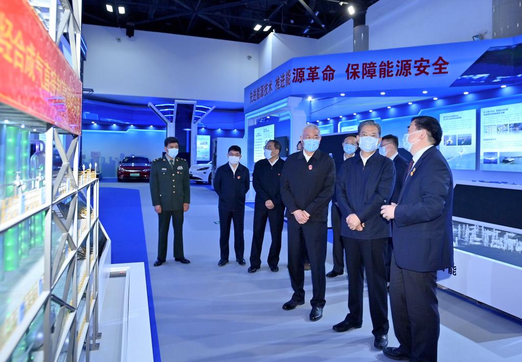 Zhao Leji, a member of the Standing Committee of the Political Bureau of the Communist Party of China (CPC) Central Committee and secretary of the CPC Central Commission for Discipline Inspection, visits an exhibition of China's achievements in scientific and technological innovation during the 13th Five-Year Plan period (2016-2020) in Beijing, capital of China, Oct. 26, 2021. (Xinhua/Yue Yuewei)