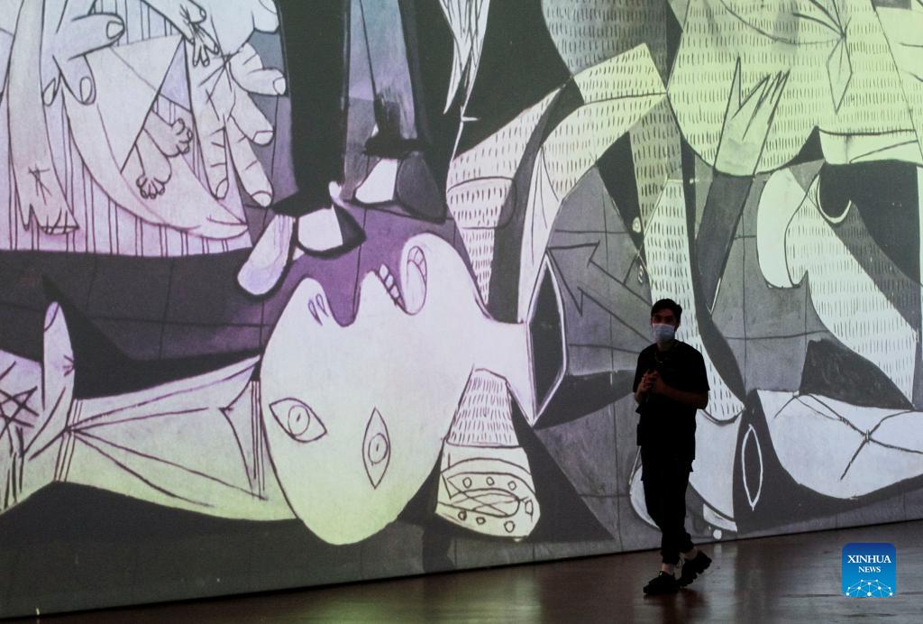 A person attends a preview of the Imagine Picasso immersive exhibition in Vancouver, British Columbia, on Oct. 26, 2021. Unleashed from frames to inhabit the space in a continuous flow, more than 200 of Picasso's works are projected at the Imagine Picasso immersive exhibition, which will run in Vancouver from Oct. 27, 2021 until Jan. 8. 2022. (Photo by Liang Sen/Xinhua)