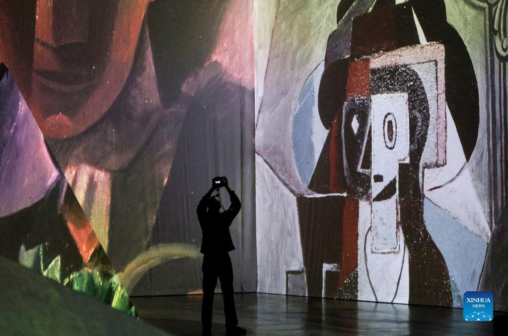 A person attends a preview of the Imagine Picasso immersive exhibition in Vancouver, British Columbia, on Oct. 26, 2021. Unleashed from frames to inhabit the space in a continuous flow, more than 200 of Picasso's works are projected at the Imagine Picasso immersive exhibition, which will run in Vancouver from Oct. 27, 2021 until Jan. 8. 2022. (Photo by Liang Sen/Xinhua)