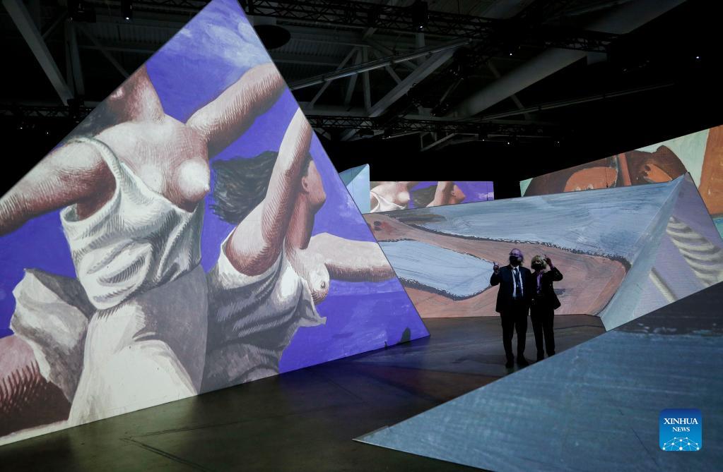 People attend a preview of the Imagine Picasso immersive exhibition in Vancouver, British Columbia, on Oct. 26, 2021. Unleashed from frames to inhabit the space in a continuous flow, more than 200 of Picasso's works are projected at the Imagine Picasso immersive exhibition, which will run in Vancouver from Oct. 27, 2021 until Jan. 8. 2022. (Photo by Liang Sen/Xinhua)
