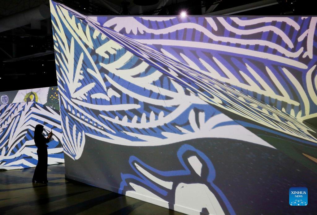 A person attends a preview of the Imagine Picasso immersive exhibition in Vancouver, British Columbia, on Oct. 26, 2021. Unleashed from frames to inhabit the space in a continuous flow, more than 200 of Picasso's works are projected at the Imagine Picasso immersive exhibition, which will run in Vancouver from Oct. 27, 2021 until Jan. 8. 2022. (Photo by Liang Sen/Xinhua)