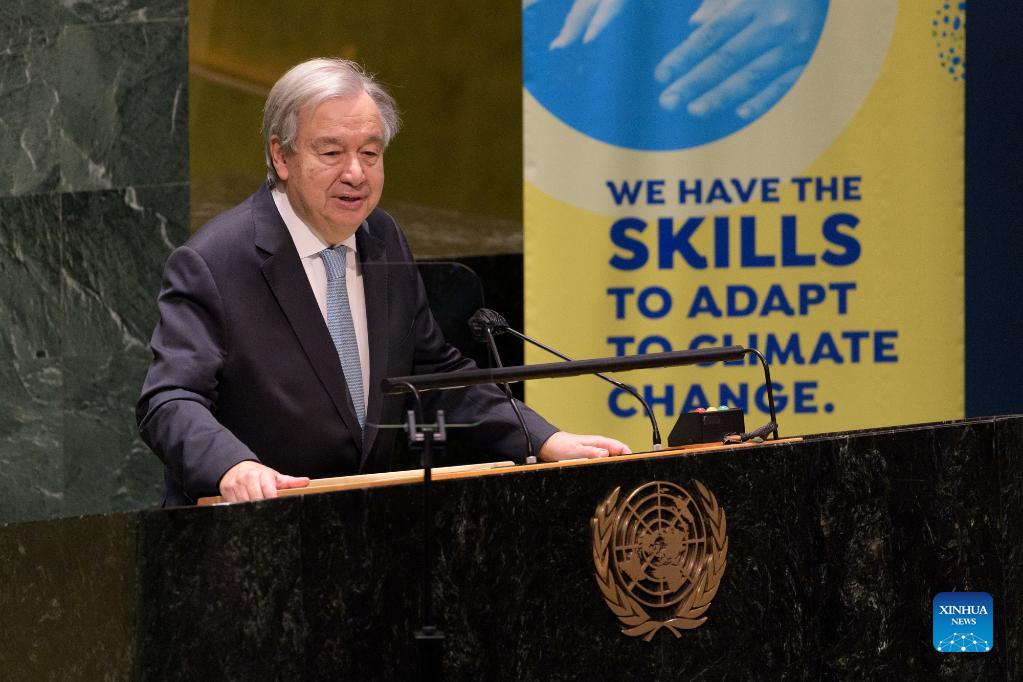United Nations Secretary-General Antonio Guterres addresses a General Assembly high-level thematic debate on climate action at UN Headquarters in New York, on Oct. 26, 2021. Guterres said Tuesday that the climate crisis is a code red for humanity and that urgent action is needed before it is too late. (Manuel Elias/UN Photo/Handout via Xinhua)
