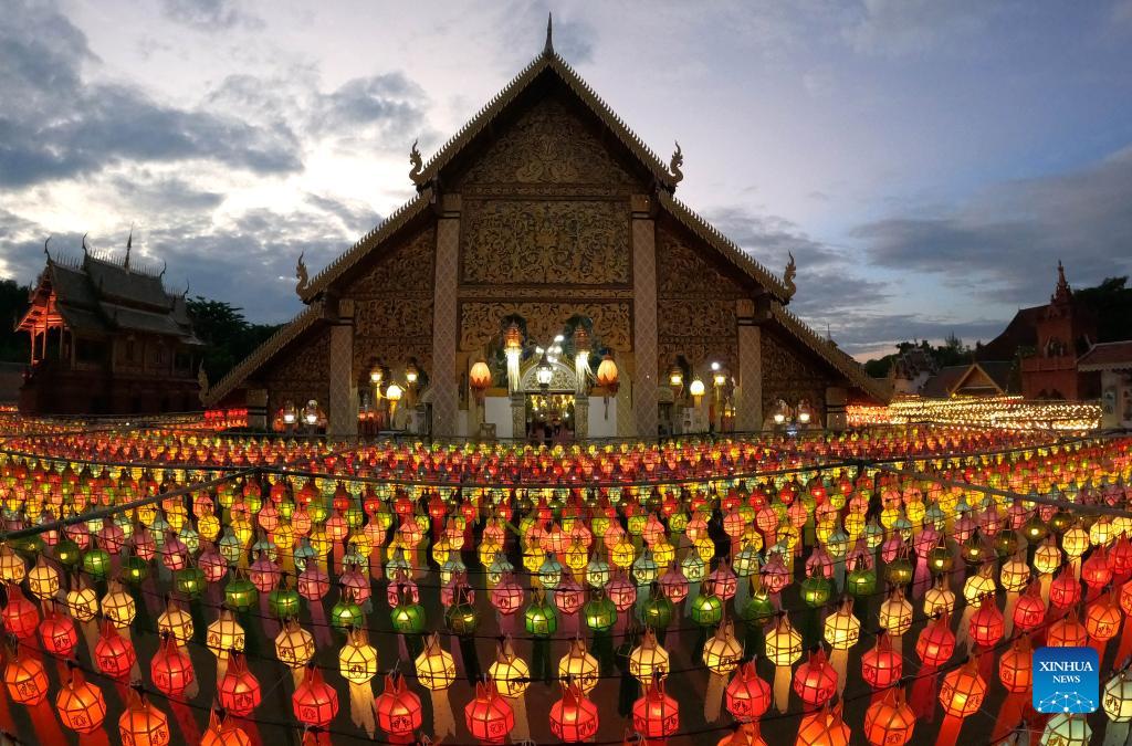 Colorful lanterns are seen at the Wat Phra That Hariphunchai in Lamphun, Thailand, Oct. 25, 2021. Lamphun Province of Thailand held a grand lantern festival at the Wat Phra That Hariphunchai, attracting tourists to hang lanterns and make wishes. (Xinhua/Wang Teng)
