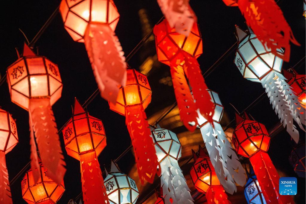 Colorful lanterns are seen at the Wat Phra That Hariphunchai in Lamphun, Thailand, Oct. 25, 2021. Lamphun Province of Thailand held a grand lantern festival at the Wat Phra That Hariphunchai, attracting tourists to hang lanterns and make wishes. (Xinhua/Wang Teng)