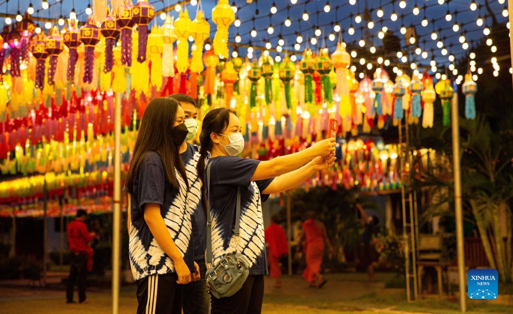 Tourists take selfies at the Wat Phra That Hariphunchai in Lamphun, Thailand, Oct. 25, 2021. Lamphun Province of Thailand held a grand lantern festival at the Wat Phra That Hariphunchai, attracting tourists to hang lanterns and make wishes. (Xinhua/Wang Teng)