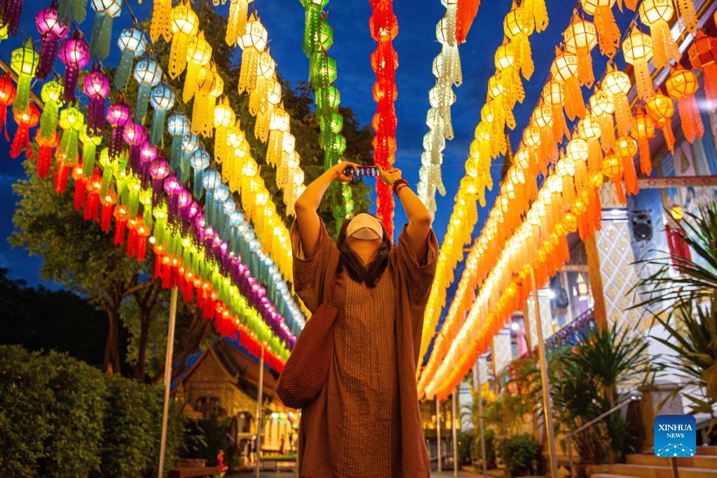 A tourist takes photos of lanterns at the Wat Phra That Hariphunchai in Lamphun, Thailand, Oct. 25, 2021. Lamphun Province of Thailand held a grand lantern festival at the Wat Phra That Hariphunchai, attracting tourists to hang lanterns and make wishes. (Xinhua/Wang Teng)