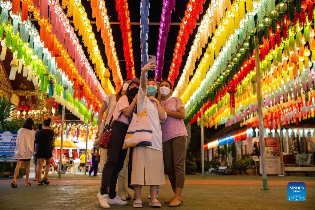 Tourists take selfies at the Wat Phra That Hariphunchai in Lamphun, Thailand, Oct. 25, 2021. Lamphun Province of Thailand held a grand lantern festival at the Wat Phra That Hariphunchai, attracting tourists to hang lanterns and make wishes. (Xinhua/Wang Teng)