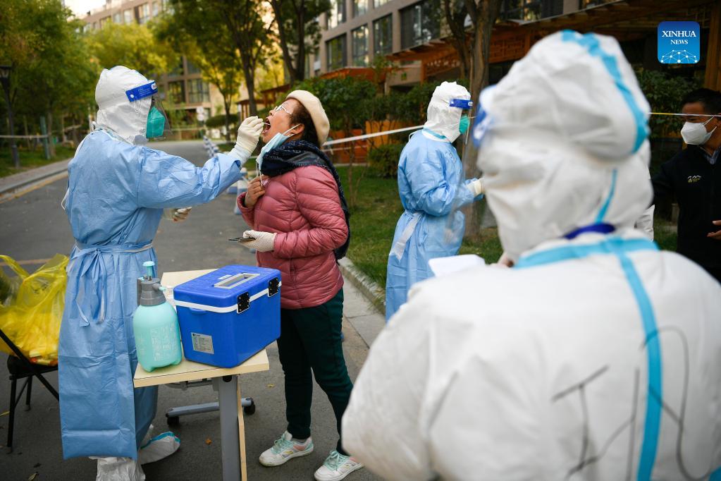 Health workers conduct nucleic acid testing for residents of a residential compound locked down due to COVID-19 resurgence in Jinfeng District, Yinchuan, northwest China's Ningxia Hui Autonomous Region, Oct. 24, 2021. (Xinhua/Wang Peng)