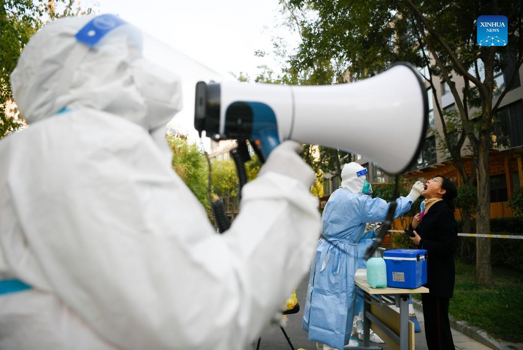 Health workers conduct nucleic acid testing for residents of a residential compound locked down due to COVID-19 resurgence in Jinfeng District, Yinchuan, northwest China's Ningxia Hui Autonomous Region, Oct. 24, 2021. (Xinhua/Wang Peng)