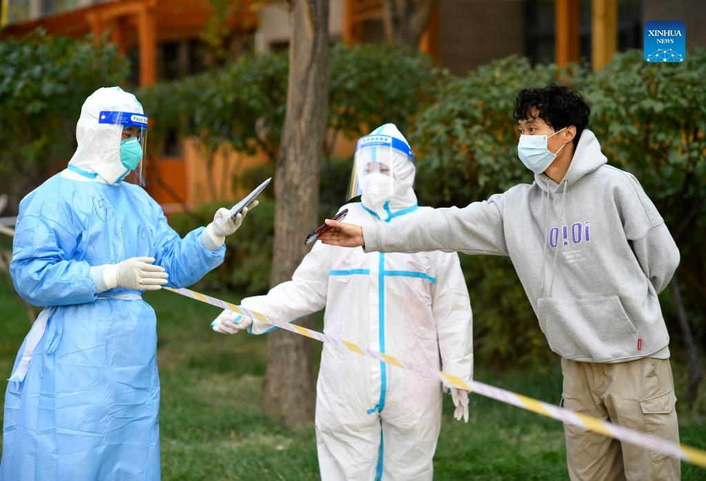 Staff members register personal information of a resident for nucleic acid testing at a residential compound locked down due to COVID-19 resurgence in Jinfeng District, Yinchuan, northwest China's Ningxia Hui Autonomous Region, Oct. 24, 2021. (Xinhua/Wang Peng)