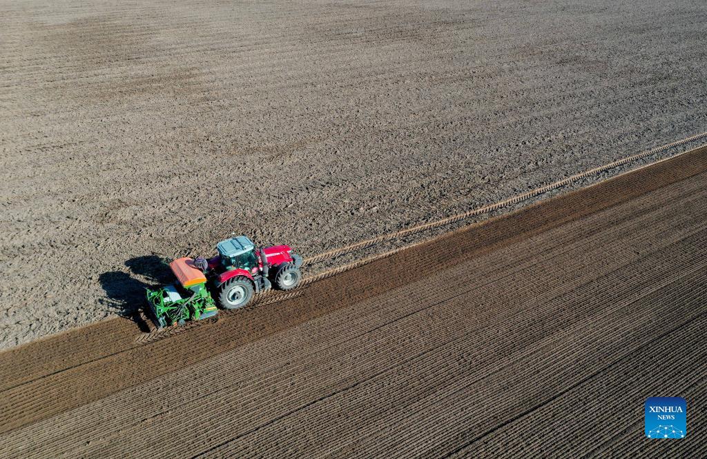 Aerial photo taken on Oct. 26, 2021 shows an agricultural machine sowing seeds of winter wheat in the fields at Yanli Township in Xingtai, north China's Hebei Province. (Xinhua/Zhu Xudong)