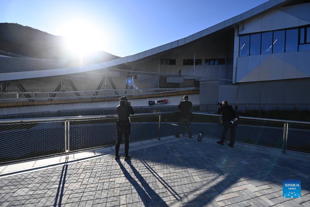 Photographers take shots during a test event for Beijing 2022 Olympic Winter Games at the National Sliding Center in Yanqing Zone, Beijing, capital of China, Oct. 26, 2021. (Xinhua/He Changshan)