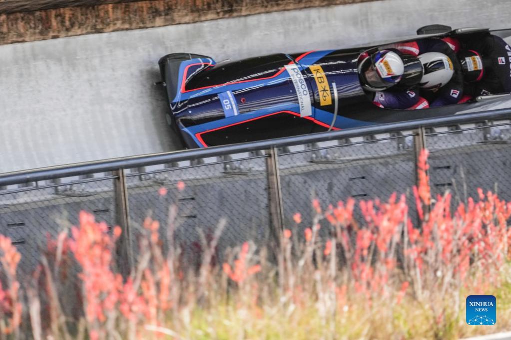 Suk Youngjin, Kim Taeyang, Kim Hyeonggeun and Jang Kikun of South Korea compete for a 4-man heat of Bobsleigh during a test event for Beijing 2022 Olympic Winter Games at the National Sliding Center in Yanqing Zone, Beijing, capital of China, Oct. 26, 2021. (Xinhua/Peng Ziyang)