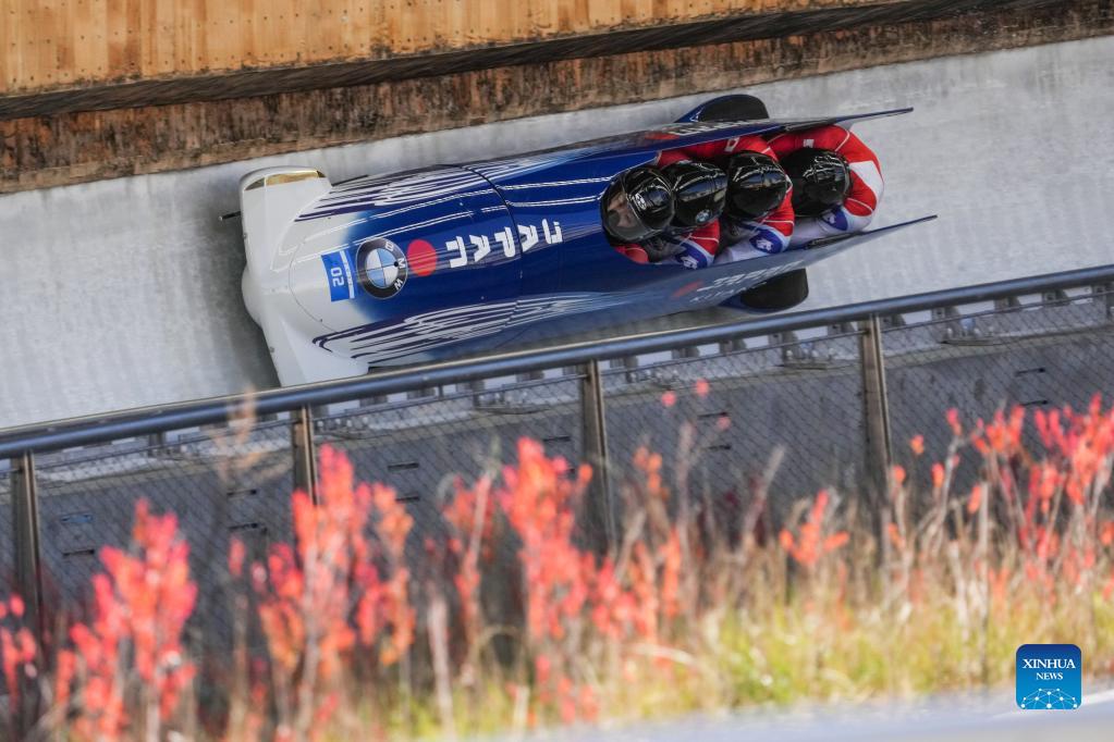Shinohara Ryo, Hamano Tatsuya, Kaneko Yoshiki and Kurihara Takashi of Japan compete for a 4-man heat of Bobsleigh during a test event for Beijing 2022 Olympic Winter Games at the National Sliding Center in Yanqing Zone, Beijing, capital of China, Oct. 26, 2021. (Xinhua/Peng Ziyang)