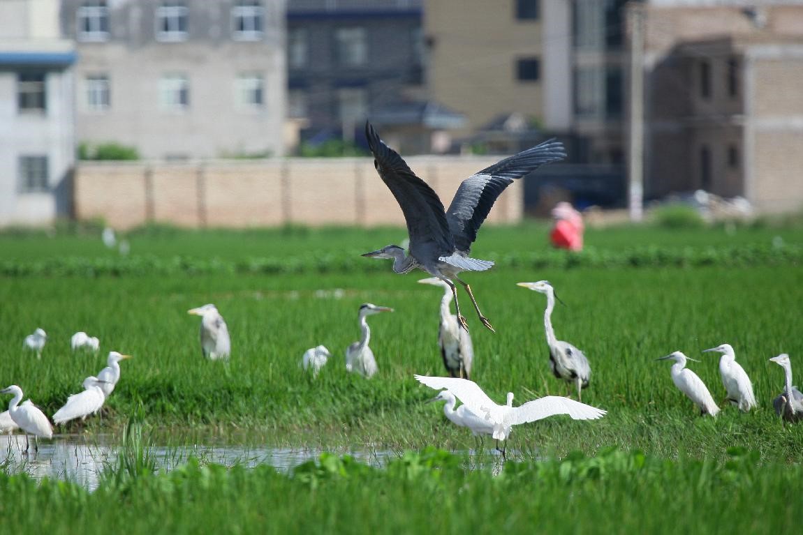 Photo taken on June 13, 2021 shows egrets foraging and playing in a paddy field in Qujing city, southwest China’s Yunnan province. (People’s Daily Online/Yang Junpeng)