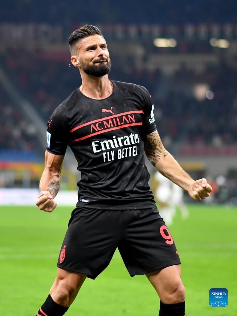 AC Milan's Olivier Giroud celebrates his goal during a Serie A football match between AC Milan and Torino in Milan, Italy, on Oct. 26, 2021. (Str/Xinhua)