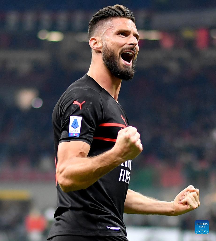 AC Milan's Olivier Giroud celebrates his goal during a Serie A football match between AC Milan and Torino in Milan, Italy, on Oct. 26, 2021. (Str/Xinhua)