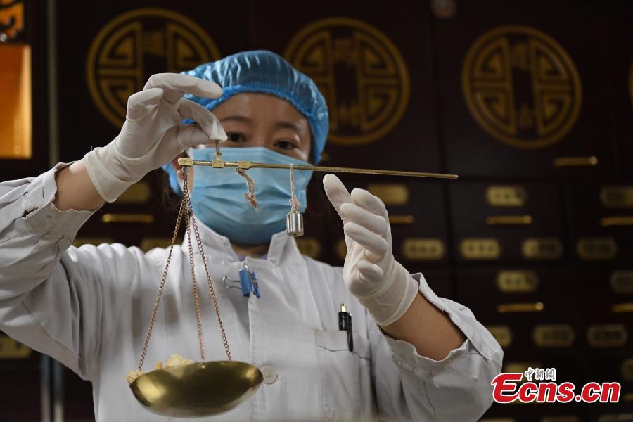 A pharmacist dispenses Chinese herbal medicine at Gansu Provincial Hospital of Traditional Chinese Medicine (TCM) in Lanzhou, Northwest China's Gansu Province, Oct. 26, 2021. (Photo: China News Service/Zhang Wei)