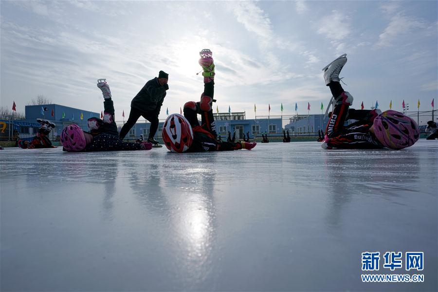 A teacher gives students instructions on skating at Taipingzhuang Center School in Yanqing district, Beijing, Jan 9, 2019. [Photo/Xinhua]