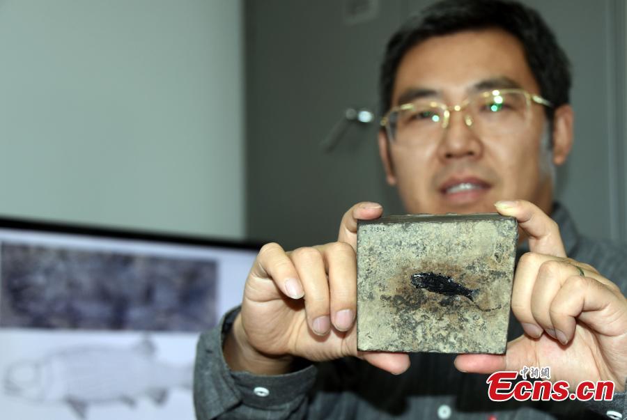 Photo taken on Oct. 26, 2021 shows Xu Guanghui, researcher in Institute of Vertebrate Paleontology and Paleoanthropology in Chinese Academy of Sciences, introducing the fossil specimen of the oldest species of Peltoperleidus. (Photo: China News Service/Sun Zifa)