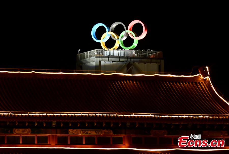 The Olympic rings at Shougang Park light up in Beijing, capital of China, on the evening of October 26, 2021. (Photo: China News Service/Zhang Xinglong)