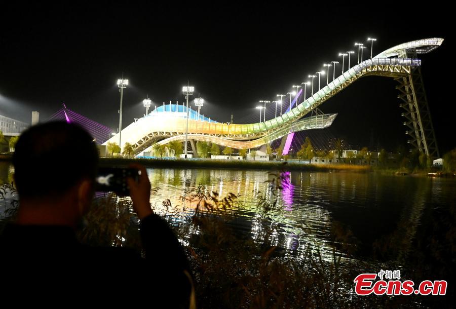 The Shougang Ski Jumping Platform, one of the competition venues for the Beijing 2022 Winter Olympics, light up in Beijing, capital of China, on the evening of October 26, 2021. (Photo: China News Service/Zhang Xinglong)