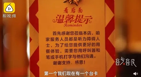 According to Wang Chuang, the owner of the restaurant, he has employed a few tactics to eliminate communication barriers between customers and his employees. For instance, on each table a card is placed that reads “please use the service paging system, or write out messages with your phone or a pen to communicate with the waiters or waitresses.” Also, each of the employees wears an electronic bracelet, and if customers have any requests during their meal, they can press the button and a signal will be transferred to the bracelet, with the device’s vibrations letting the waiters or waitresses know about the service request.