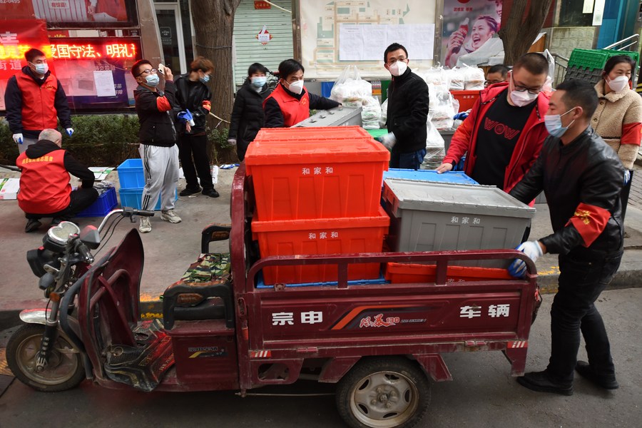 Staff members transfer free meals for residents at a residential area under temporary lockdown due to resurgence of COVID-19 in Chengguan District of Lanzhou, northwest China's Gansu Province, Oct. 25, 2021. Local authorities, in cooperation with food production and catering enterprises, provide free meals for local residents in residential areas under lockdown in Lanzhou every day. (Xinhua/Fan Peishen)