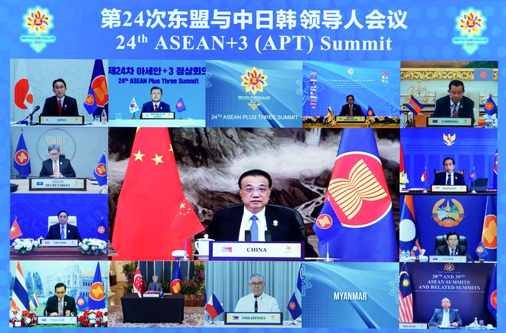 Chinese Premier Li Keqiang attends the 24th ASEAN Plus China, Japan and ROK Summit via video link, at the Great Hall of the People in Beijing, capital of China, Oct. 27, 2021. (Xinhua/Zhang Ling)