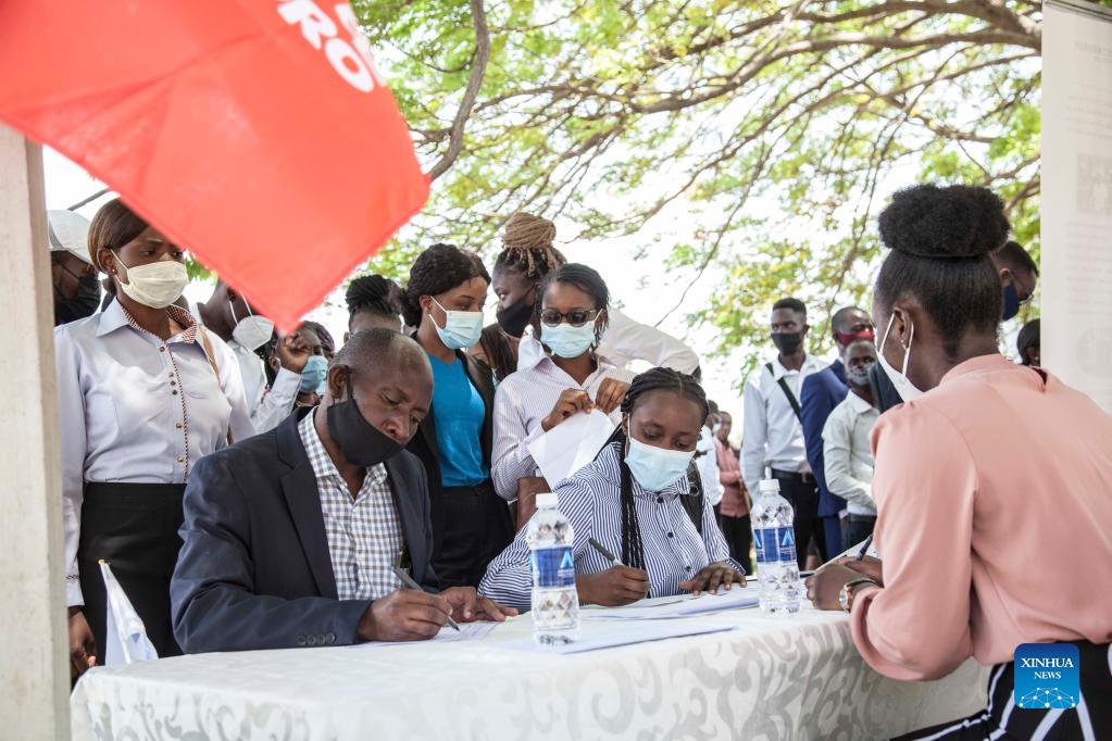 People attend a jobs and career expo at the University of Zambia in Lusaka, Zambia, on Oct. 27, 2021. The Confucius Institute at the University of Zambia (UNZA) on Wednesday held the fourth jobs and career expo where Chinese enterprises based in the southern African nation showcased themselves and tried to lure the local workforce, especially graduating students. (Photo by Martin Mbangweta/Xinhua)
