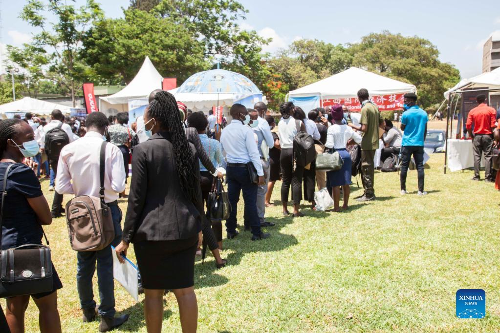 People attend a jobs and career expo at the University of Zambia in Lusaka, Zambia, on Oct. 27, 2021. The Confucius Institute at the University of Zambia (UNZA) on Wednesday held the fourth jobs and career expo where Chinese enterprises based in the southern African nation showcased themselves and tried to lure the local workforce, especially graduating students. (Photo by Martin Mbangweta/Xinhua)