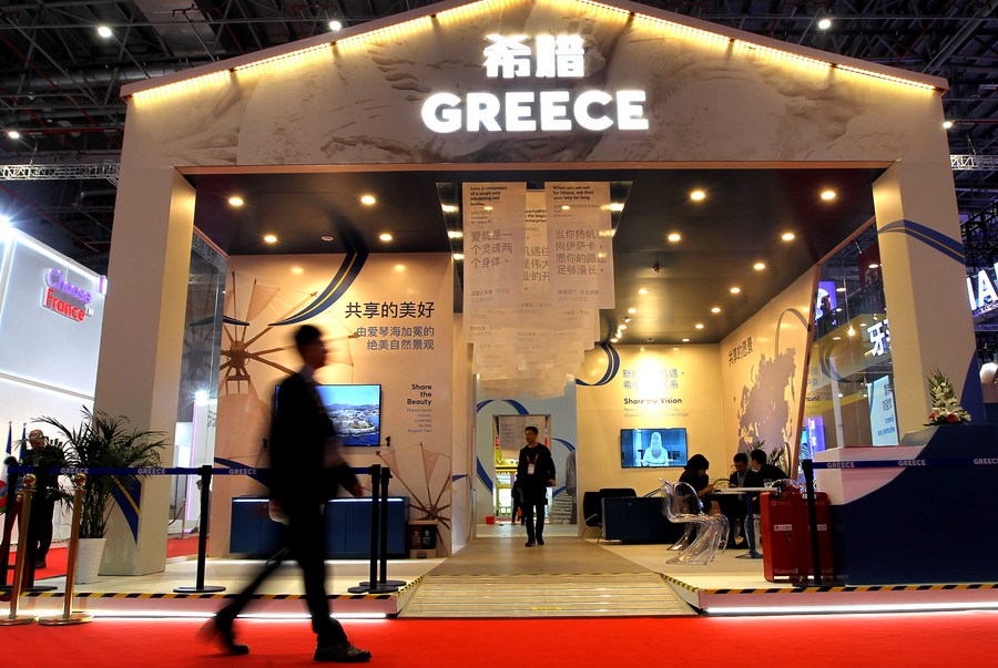 A visitor walks past the Greece pavilion during the second China International Import Expo (CIIE) in Shanghai, east China, Nov. 5, 2019. (Xinhua/Chen Fei)