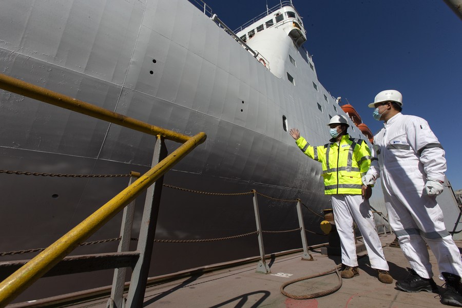 Chinese employees Ma Liang (R) and Zhang Baohua inspect the ship repair work at the Ship Repair Zone in the Piraeus port, Greece, Feb. 3, 2021. (Xinhua/Marios Lolos)