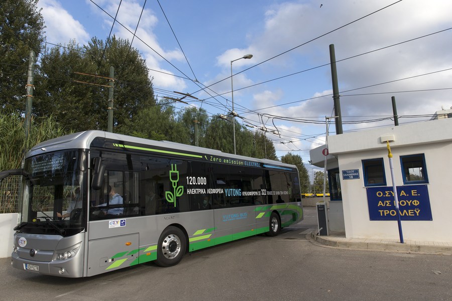 The electric bus Yutong U12 from China is seen starting its first route in Athens, Greece, Oct. 21, 2020. (Xinhua/Marios Lolos)