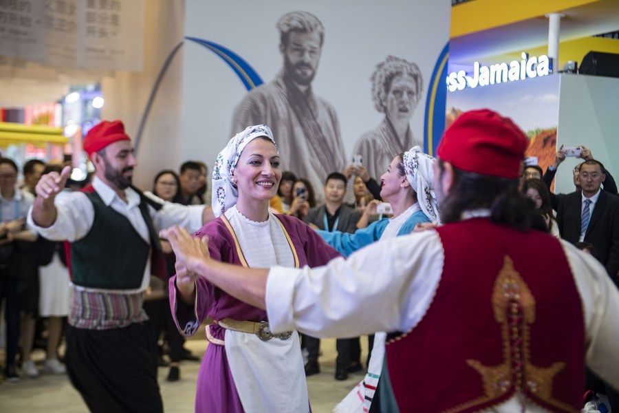 Performers dance at the Greece pavilion during the second China International Import Expo (CIIE) in Shanghai, east China, Nov. 7, 2019. (Xinhua/Purbu Zhaxi)