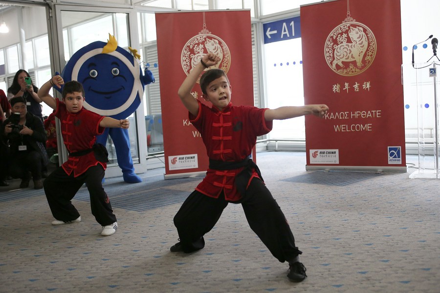 Children perform martial arts during an event to celebrate Chinese Lunar New Year at the Athens International Airport in Athens, Greece, on Feb. 6, 2019. (Xinhua/Marios Lolos)