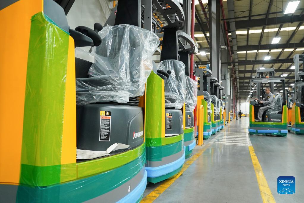 A worker works at a production line of Jungheinrich AG in Qingpu district of east China's Shanghai, Oct. 20, 2021. Jungheinrich AG, a leading intralogistics solutions provider based in Germany, would take part in the China International Import Expo (CIIE) for the fourth time this year. (Xinhua/Ding Ting)