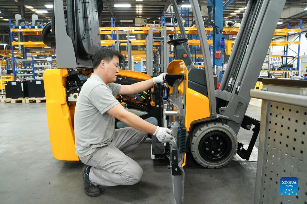 A worker works at a production line of Jungheinrich AG in Qingpu district of east China's Shanghai, Oct. 20, 2021. Jungheinrich AG, a leading intralogistics solutions provider based in Germany, would take part in the China International Import Expo (CIIE) for the fourth time this year. (Xinhua/Ding Ting)