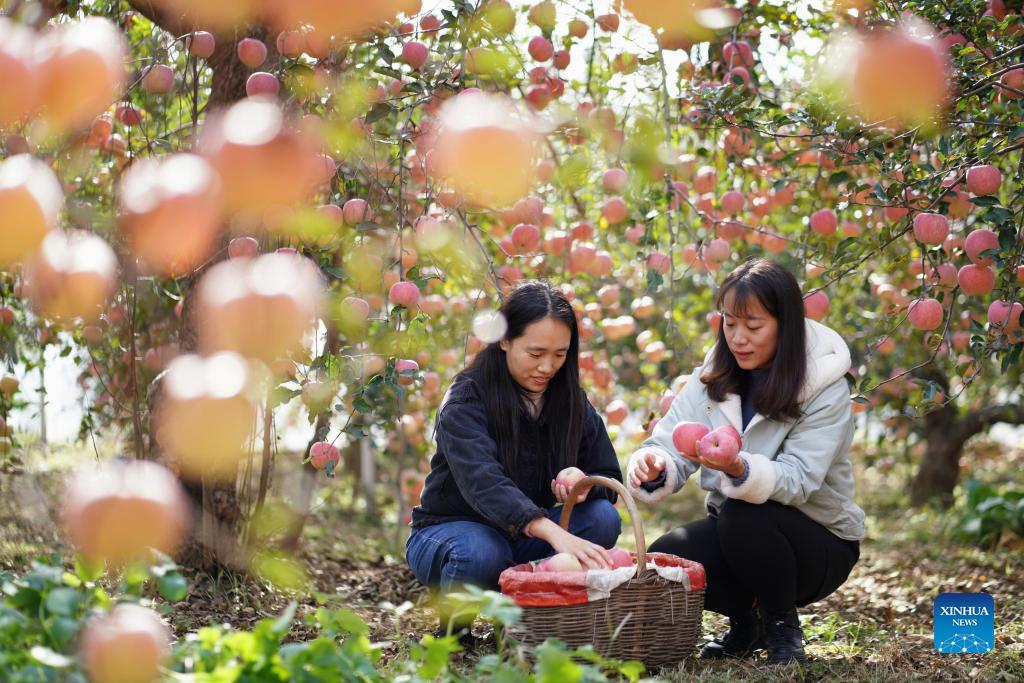 Tourists sort apples picked at an orchard in Gangdi Village of Neiqiu County in Xingtai City, north China's Hebei Province, Oct. 27, 2021. Local farmers started to harvest 3,500 mu (about 233 hectare) of apple recently. (Xinhua/Zhu Xudong)