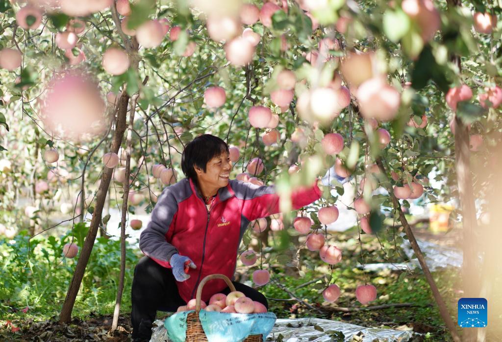 A grower sorts apples in an orchard in Gangdi Village of Neiqiu County in Xingtai City, north China's Hebei Province, Oct. 27, 2021. Local farmers started to harvest 3,500 mu (about 233 hectare) of apple recently. (Xinhua/Zhu Xudong)