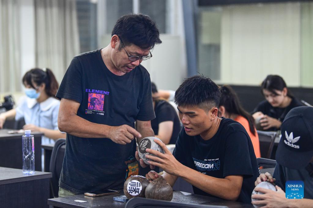 Ke Qiufeng instructs in a coconut carving class at Hainan Vocational University in Haikou, south China's Hainan Province, Oct. 20, 2021. Coconut carving, one of China's national intangible Cultural Heritage, has a history of thousands of years in Hainan Province. Made of coconut shell, wood and palm as the material, a good coconut carving work needs to go through complicated procedures and requires refined skills and great patience of a craftsman. Ke Qiufeng, 51, has been engaging in coconut carving since 1994 when he began to learn the skill in a factory. "I just fell in love with it at the first sight," he said. In Ke's eyes, no matter he is making a decorative painting, a delicate vase or just a bowl people would use every day, it's a piece of art. "You must be extremely concentrated when you are carving, or you will get hurt by the knife," Ke said. After years of hard work, Ke has been selected as a representative inheritor of Hainan coconut carvings in the provincial level. In addition to making coconut carvings himself, Ke also gives lectures to students at Hainan Vocational and Technical College every week. Seeing fewer and fewer people would like to devote in this traditional skill, Ke Qiufeng is more worried than anyone. "The skill of coconut carving has been inherited for thousands of years. It would be a pity if it was lost in our generation. That's why I need to keep it alive," he said. (Xinhua/Pu Xiaoxu)