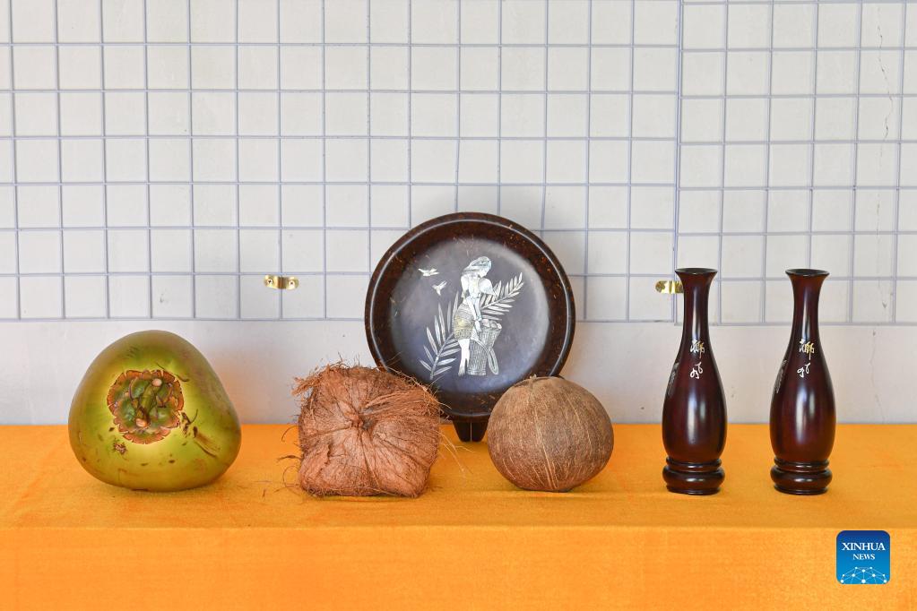 Photo taken on Sept. 14, 2021 shows coconut, coconut shell and coconut carving products (from L to R) at Ke Qiufeng's studio in Ruchuan Village of Haikou, south China's Hainan Province. Coconut carving, one of China's national intangible Cultural Heritage, has a history of thousands of years in Hainan Province. Made of coconut shell, wood and palm as the material, a good coconut carving work needs to go through complicated procedures and requires refined skills and great patience of a craftsman. Ke Qiufeng, 51, has been engaging in coconut carving since 1994 when he began to learn the skill in a factory. "I just fell in love with it at the first sight," he said. In Ke's eyes, no matter he is making a decorative painting, a delicate vase or just a bowl people would use every day, it's a piece of art. "You must be extremely concentrated when you are carving, or you will get hurt by the knife," Ke said. After years of hard work, Ke has been selected as a representative inheritor of Hainan coconut carvings in the provincial level. In addition to making coconut carvings himself, Ke also gives lectures to students at Hainan Vocational and Technical College every week. Seeing fewer and fewer people would like to devote in this traditional skill, Ke Qiufeng is more worried than anyone. "The skill of coconut carving has been inherited for thousands of years. It would be a pity if it was lost in our generation. That's why I need to keep it alive," he said. (Xinhua/Pu Xiaoxu)