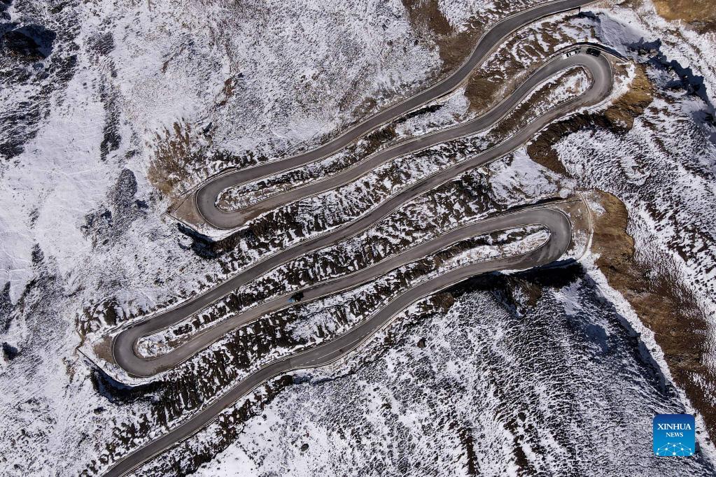 Aerial photo taken on Oct. 23, 2021 shows the winding road in Batang County, Tibetan Autonomous Prefecture of Garze, southwest China's Sichuan Province. (Xinhua/Xu Bingjie)