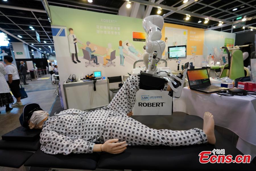 An exhibitor shows a nursing robot at the Hong Kong International Medical and Healthcare Fair, Hong Kong, Oct.27, 2021. (Photo: China News Service/Zhang Wei)