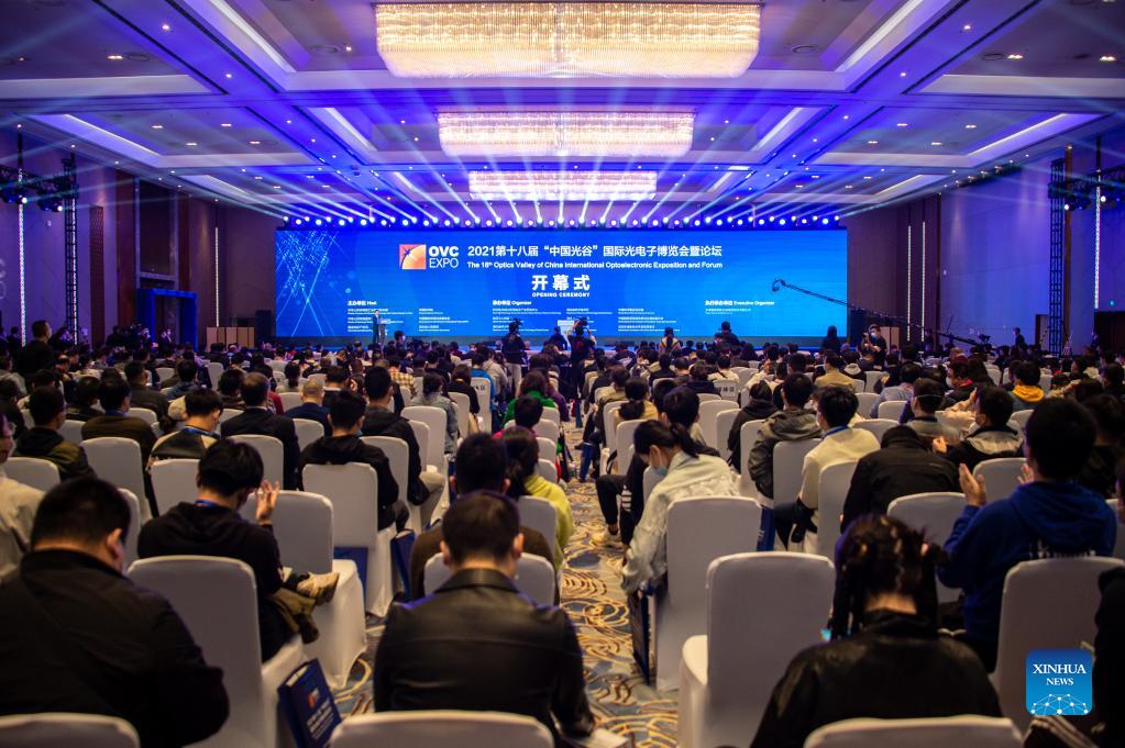 Guests attend the opening ceremony of the 18th Optics Valley of China International Optoelectronic Exposition and Forum in Wuhan, central China's Hubei Province, Oct. 27, 2021. The expo and forum opened here on Wednesday. (Photo by Wu Zhizun/Xinhua)