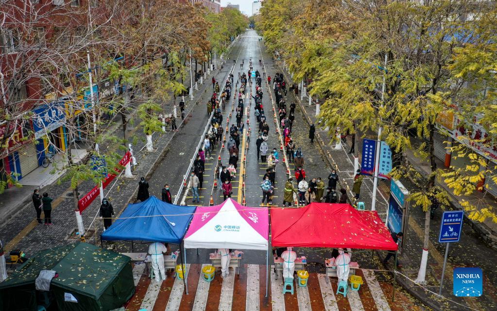 Aerial photo taken on Oct. 27, 2021 shows residents waiting in line for nucleic acid testing at a sampling site in Yinchuan, northwest China's Ningxia Hui Autonomous Region. Yinchuan launched a second round of all-inclusive nucleic acid testing on Wednesday since new confirmed COVID-19 cases were reported. (Xinhua/Feng Kaihua)