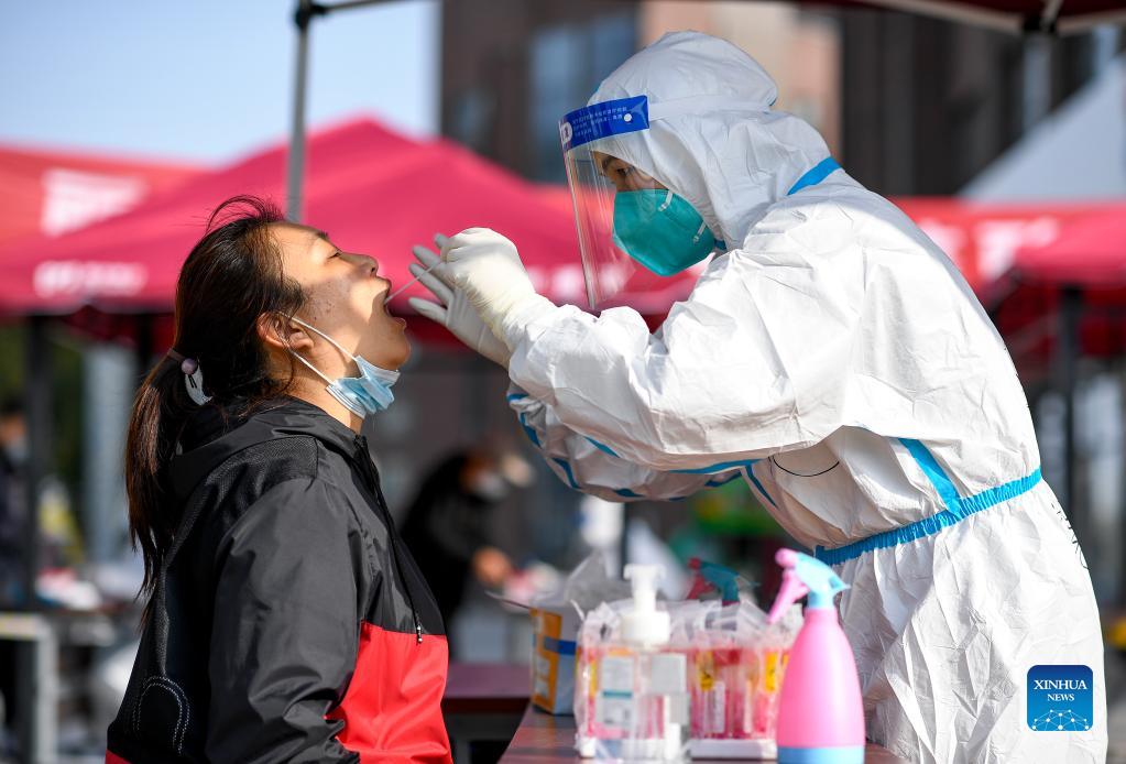 A medical worker takes a swab sample from a resident for nucleic acid testing at a sampling site in Yinchuan, northwest China's Ningxia Hui Autonomous Region, Oct. 27, 2021. Yinchuan launched a second round of all-inclusive nucleic acid testing on Wednesday since new confirmed COVID-19 cases were reported. (Xinhua/Feng Kaihua)