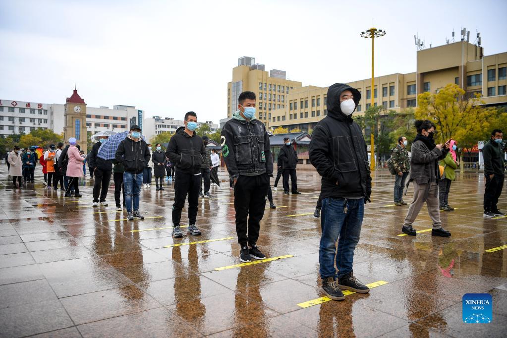 Residents queue up for nucleic acid testing at a sampling site in Yinchuan, northwest China's Ningxia Hui Autonomous Region, Oct. 27, 2021. Yinchuan launched a second round of all-inclusive nucleic acid testing on Wednesday since new confirmed COVID-19 cases were reported. (Xinhua/Feng Kaihua)