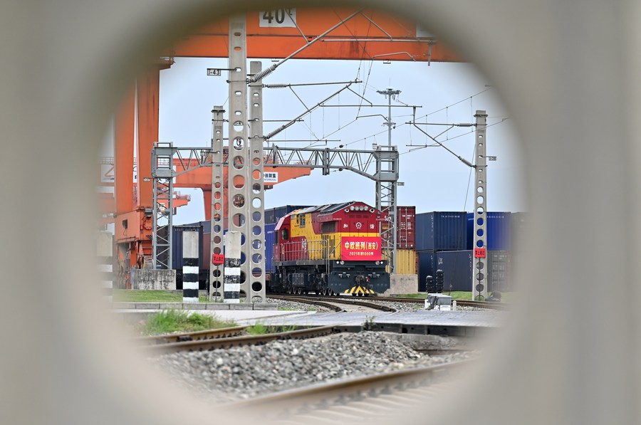 A China-Europe freight train prepares to leave Xi'an International Port for Kazakhstan in Xi'an, northwest China's Shaanxi Province, April 13, 2021. (Xinhua/Li Yibo)