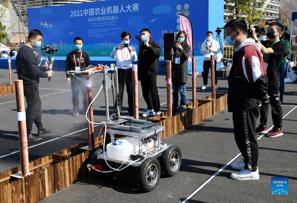 A team participates with their automatic target spraying robot in the 2021 China Agricultural Robot Competition in Qingdao, east China's Shandong Province, Oct. 27, 2021. The 2021 China Agricultural Robot Competition opened here on Wednesday. (Xinhua/Li Ziheng)